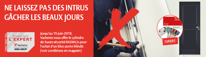 Jusqu’au 15 juin 2019, MARNAISE DE SERRURERIE votre serrurier agréé l'Expert Vachette à EPERNAY vous offre le cylindre de haute sécurité RADIALis pour l’achat d’un bloc-porte blindé Vachette.